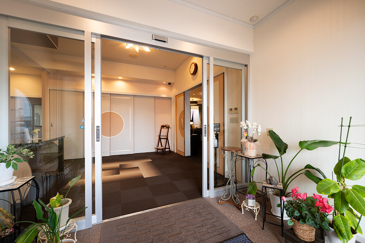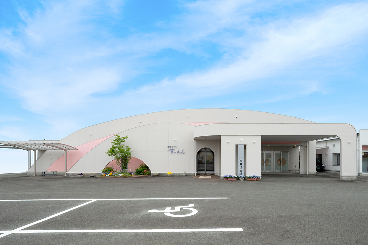 三雲本館は最大80名まで収容可能な式場を備えた葬祭ホールです。20名程度の家族葬であっても決して寂しくない式場の広さ、そして大きすぎない祭壇。1日1館の貸切葬儀ですので、気兼ねなくお別れしていただけます。
