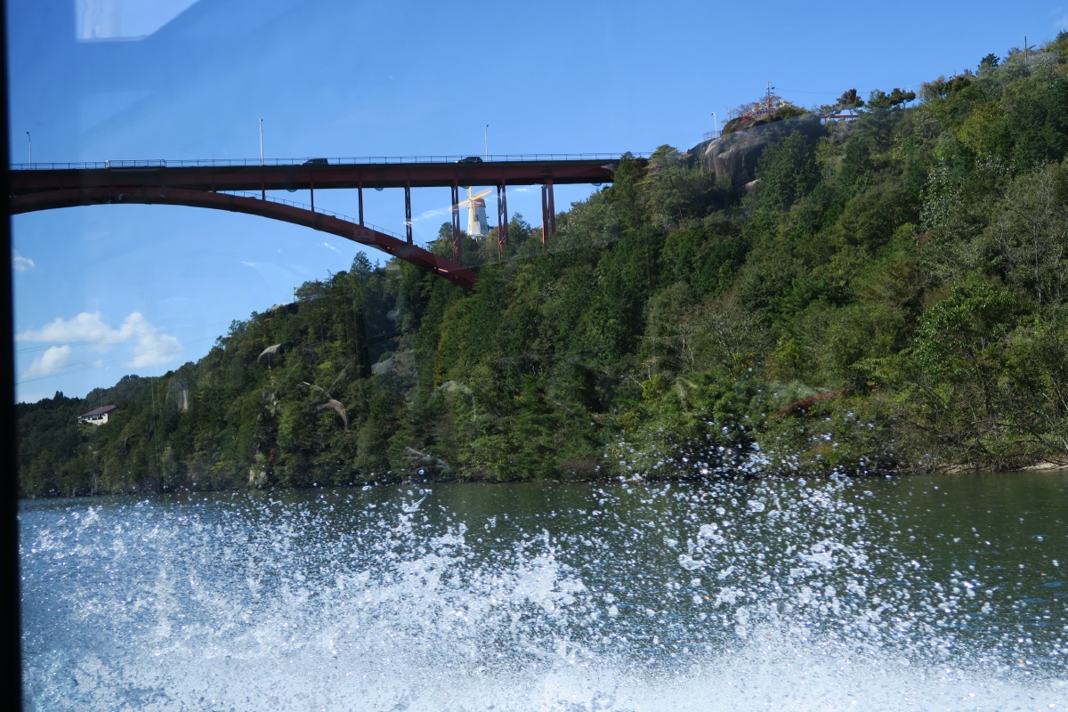 最初に訪れたのは、木曽川中流に位置する景勝地「恵那峡」です。​ここでは、高速ジェット船に乗って約30分のクルージングを楽しみました。​船は、長年の侵食や風化によって形成された奇岩や怪石が点在する渓谷を進み、参加者の皆様はその壮大な景色に感動されていました。​